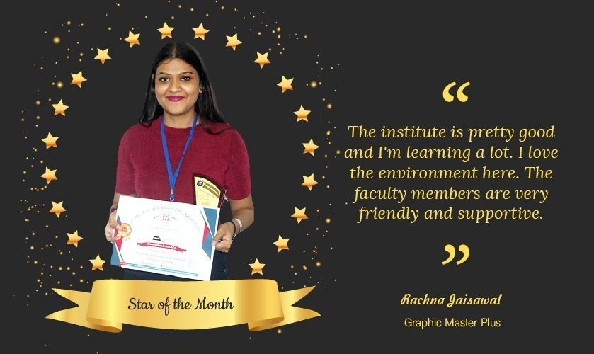 We are honored to nominate our talented student “Rachna jaiswal” as the Best Student of the Month (October). The time and effort she put up in her work is appreciating. She has got good sense of designing and creative thinking. Her experiments with every project can be seen clearly and are so much attractive as well. Her work in Photoshop and sketching is marvelous. Her working style is slightly different than others. She is hardworking, passionate, creative, sensible and sincere student. Her artwork is a masterpiece to be kept in our studio. She is very regular and takes part in every activity too.